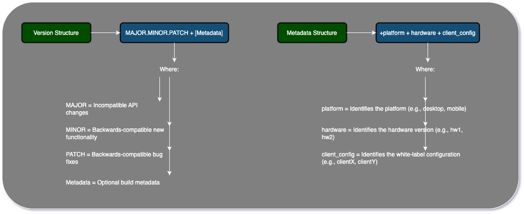 1.3.0+desktop+RPI4+clntACME: Desktop version for Raspberry Pi 4, with Acme Corp’s customizations.1.3.0+mobile+S23+clntBRZ: Mobile version for Samsung Galaxy S23, with Bronze Ltd’s customizations.2.0.0+desktop+UPX+clntCYB: Desktop version for UP Xtreme board, with Cyberdyne Systems’ customizations and breaking changes from 1.x.